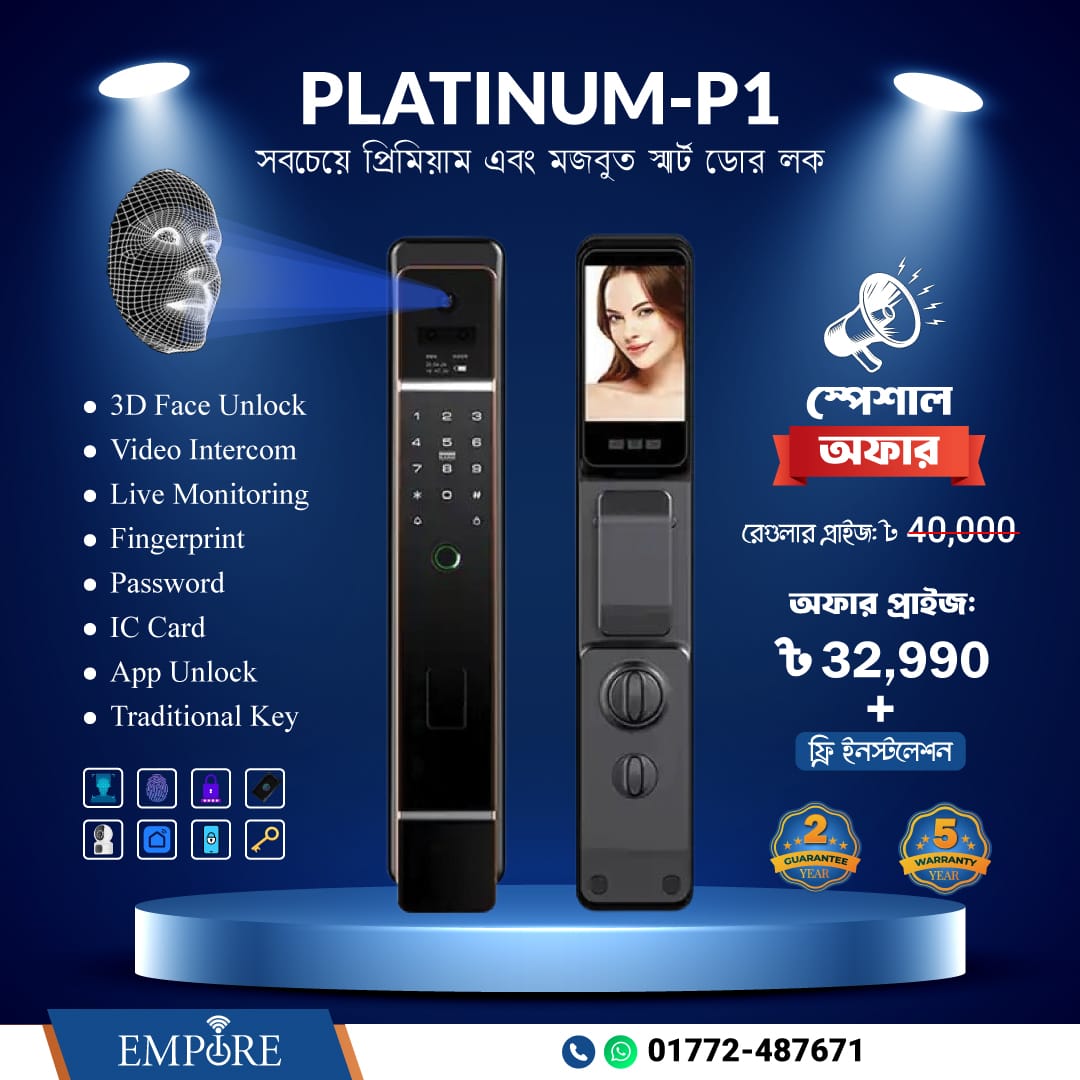 Take control of your door from anywhere in the world with the P1 3D Face Unlock Smart Door Lock. It offers multiple unlocking options, including fingerprint, face recognition, password, NFC card, app control, and traditional keys, making entry seamless and secure. The built-in doorbell allows visitors to notify you, and you can unlock the door directly through the app. With a built-in display, you can see who’s outside before granting access. Instant alarms protect against unauthorized access, while real-time notifications keep you updated on door activity. Features like guest OTP, dual verification, and strong zinc alloy construction make it a smart and reliable choice for home security.